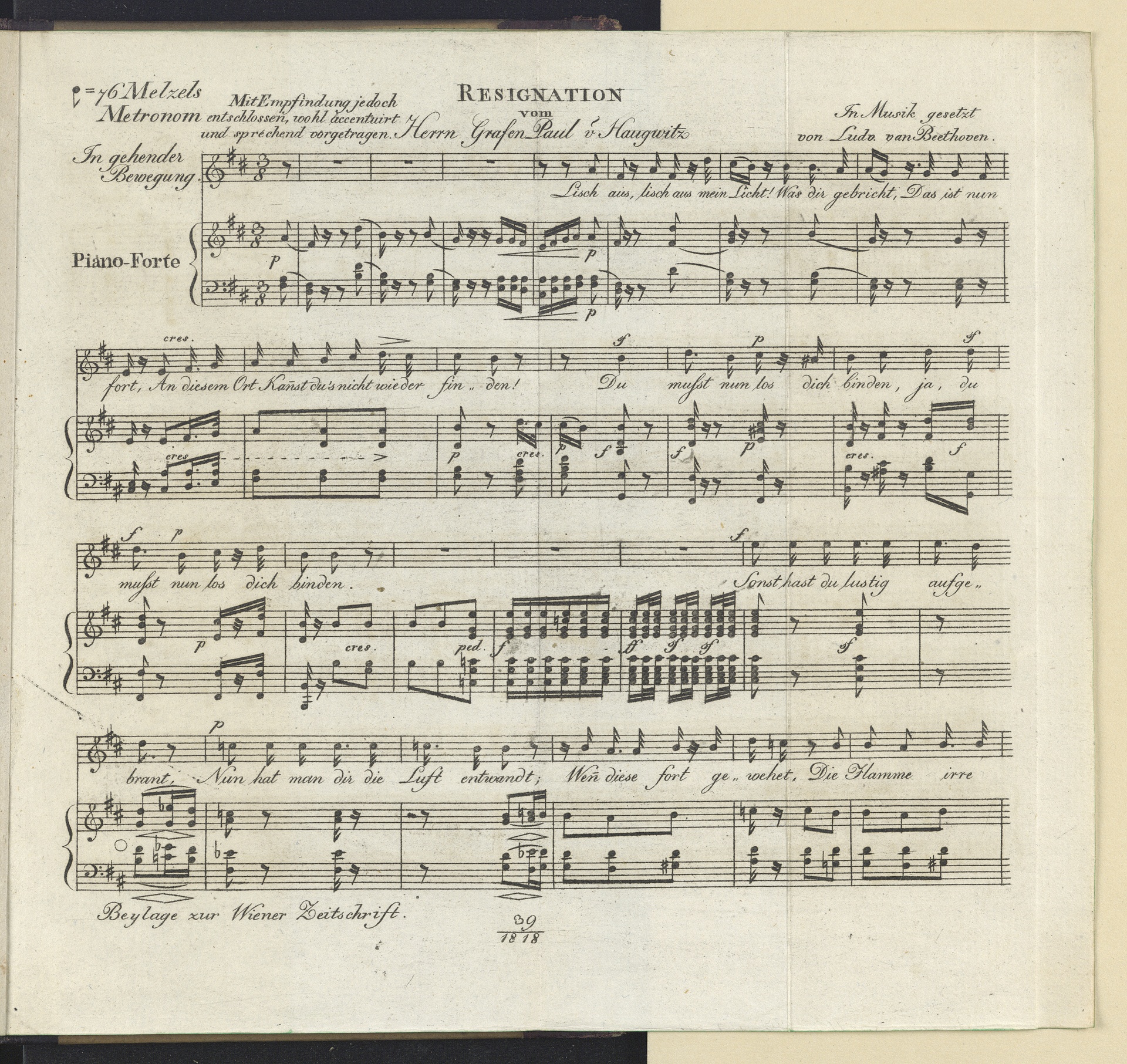 Ludwig van BeethovenPaul von Haugwitz, "Resignation", Lied für Singstimme und Klavier WoO 149, Wiener Zeitschrift für Kunst, Literatur, Theater und Mode