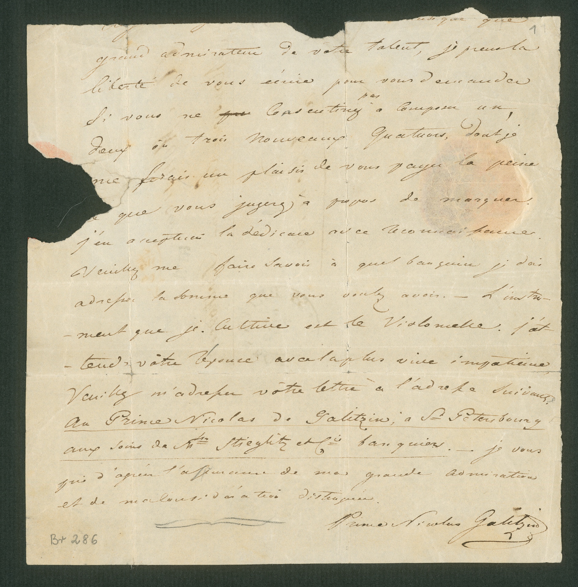 Nikolaus Galitzin, Brief an Ludwig van Beethoven in Wien, Petersburg, 9. November 1822, Autograph, Fragment