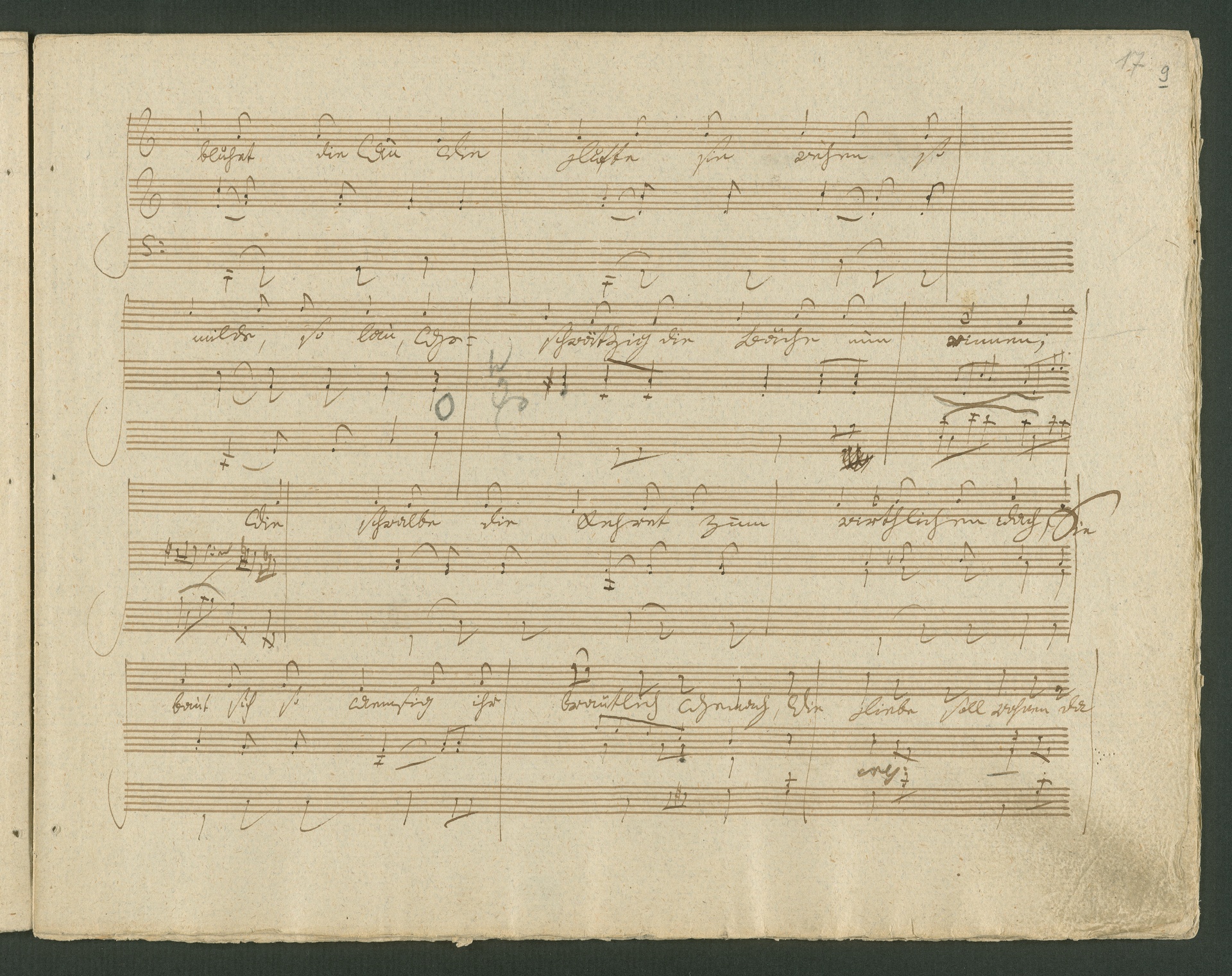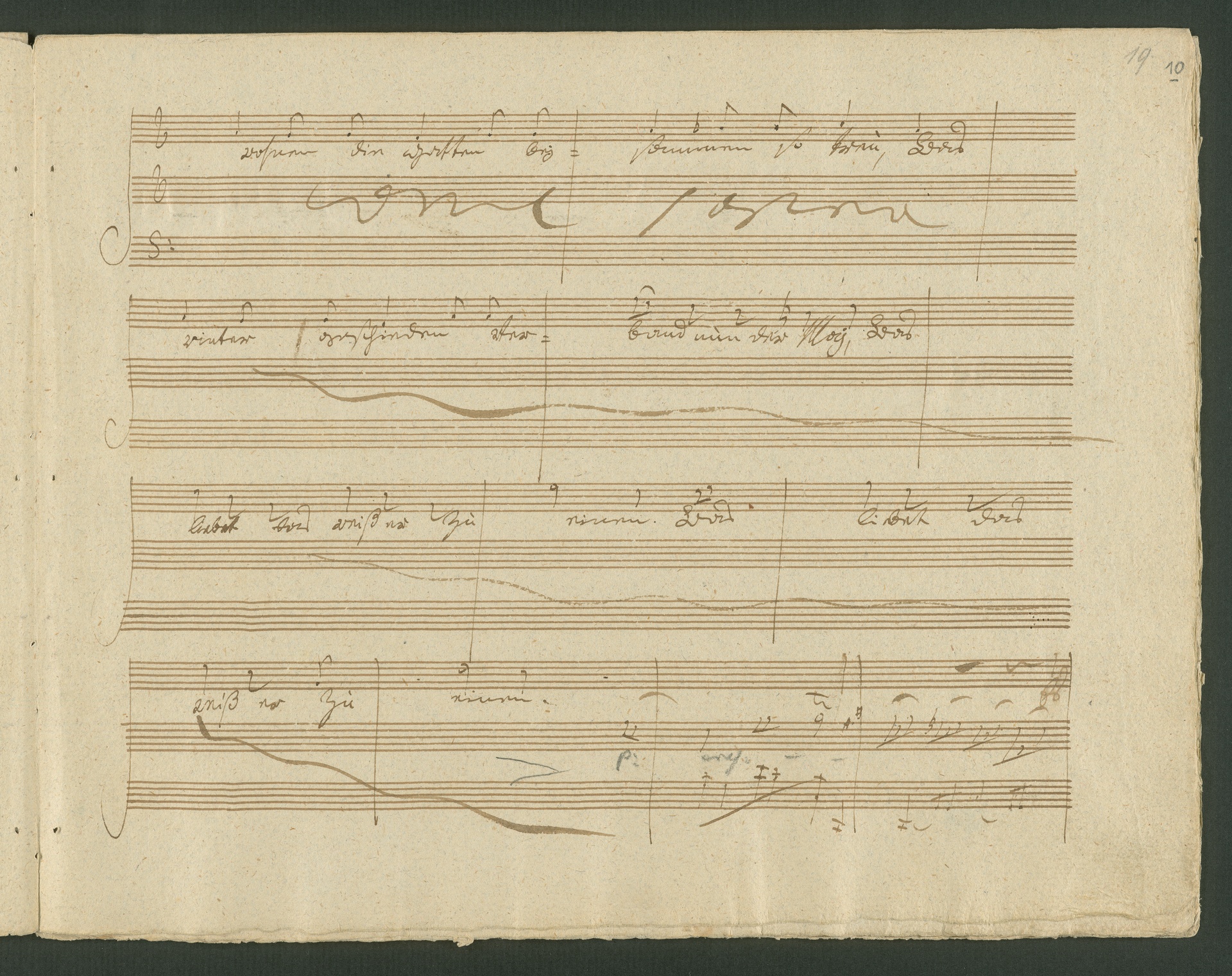 Up till now it has been unclear how Beethoven came by the text for the song cycle "An die ferne Geliebte" ("To the Distant Beloved") op 98, the autograph score of which can be seen here. There is no known authentic printed version of the text and one probably never even existed. The poet Alois Jeitteles possibly sent Beethoven the poems himself. Yet how did Jeitteles, who was studying medicine in Vienna, get to know the composer? Even this is not very clear. Beethoven might have got to know him through Ignaz Castelli, the general editor of an almanac in which Jeitteles published different poems. It is also unclear to what extent Beethoven wanted changes to the text when setting it to music, as the original model is missing. He would not have made any far-reaching changes, he might have merely added the last verse of the first song. In the autograph score Beethoven initially changed the title to "An die entfernte Geliebte" ("To the Distanced Beloved"). In the version printed he changed it to "An die ferne Geliebte" ("To the Distant Beloved"). The song cycle was composed in "1816 in the month of April" according to the date in the autograph score. (J.R.)