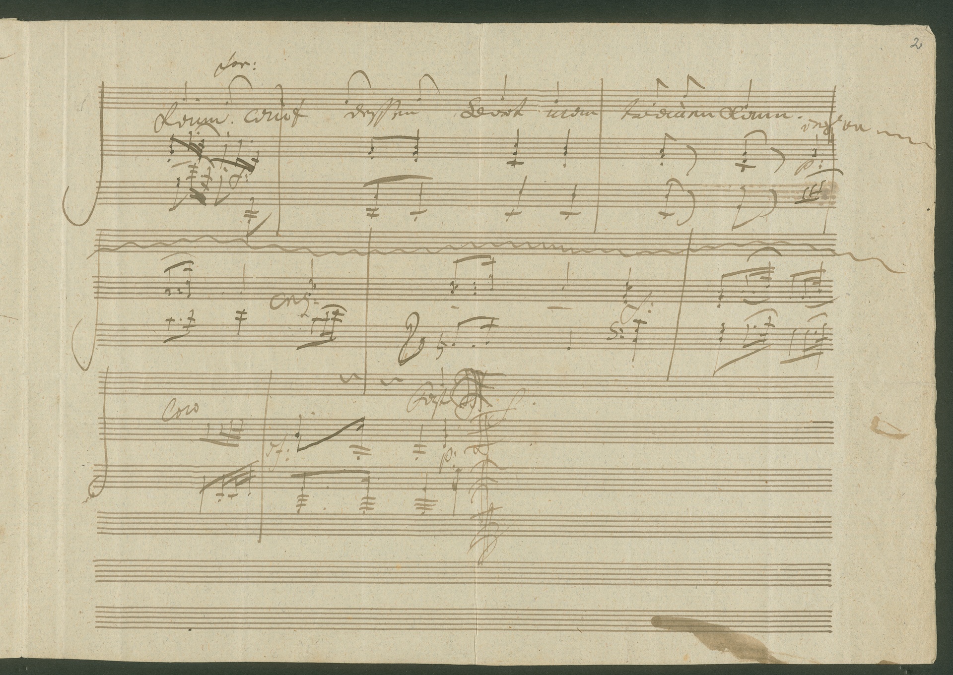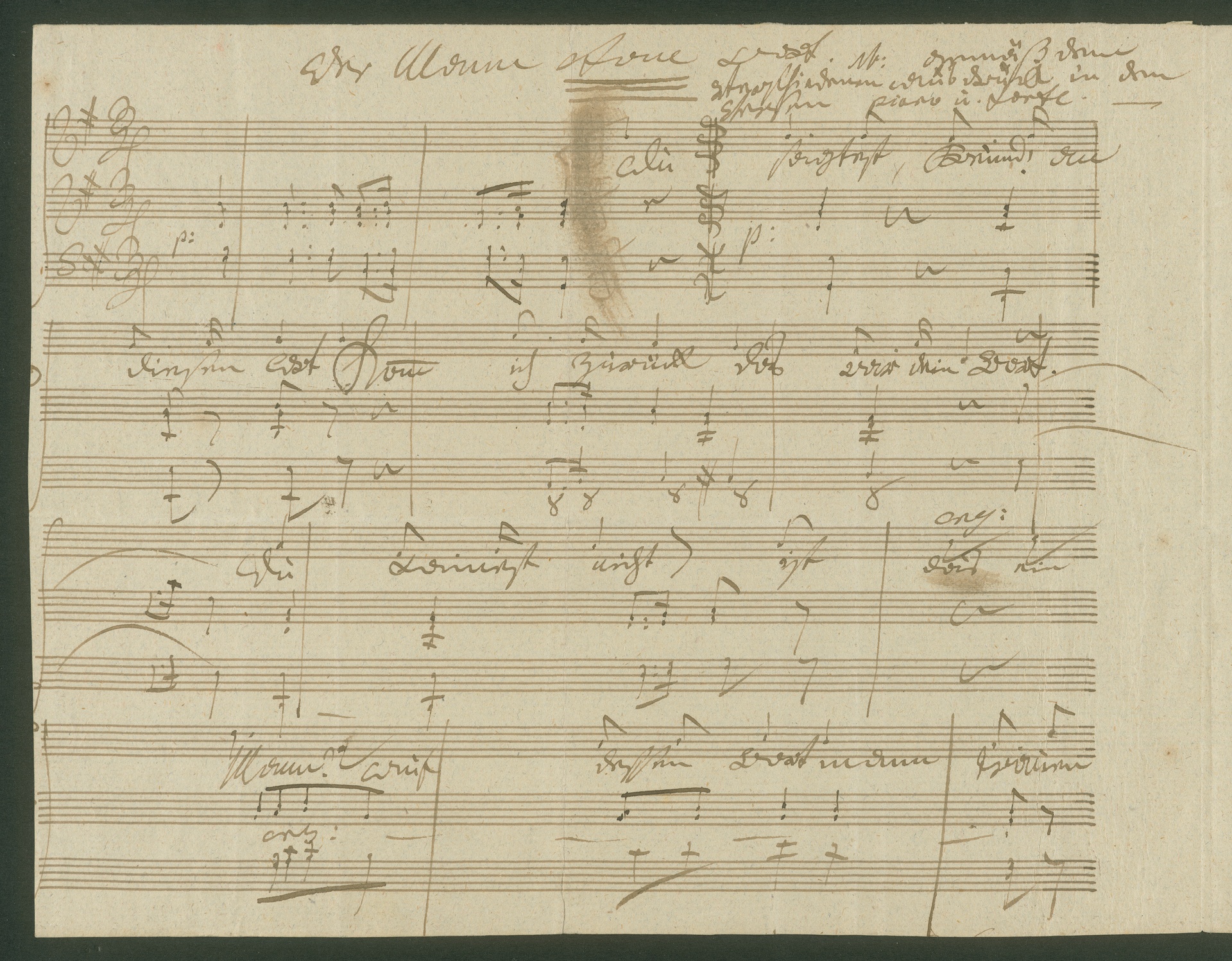 In August/September 1816 Beethoven wrote the following in a letter to Sigmund Anton Steiner, "I am sending you herewith - (as a present) - a little field piece which should be put into the armoury at once." (from the translation by Emily Anderson, 1961). The "field piece" he is referring to is probably the lied "Der Mann vom Wort" op. 99, which Beethoven's publisher Sigmund Anton Steiner published in November 1816. Although it is only a short lied, Steiner printed it with an opus number. The autograph score of the lied is written so neatly that it was possibly the engraver's model for the edition. The title of the original edition was "Der Mann von Wort". This seems to have gone against Beethoven's direct intention, as he had underlined the word "vom" several times in the title and in the first line of music in the autograph score. (J.R.)