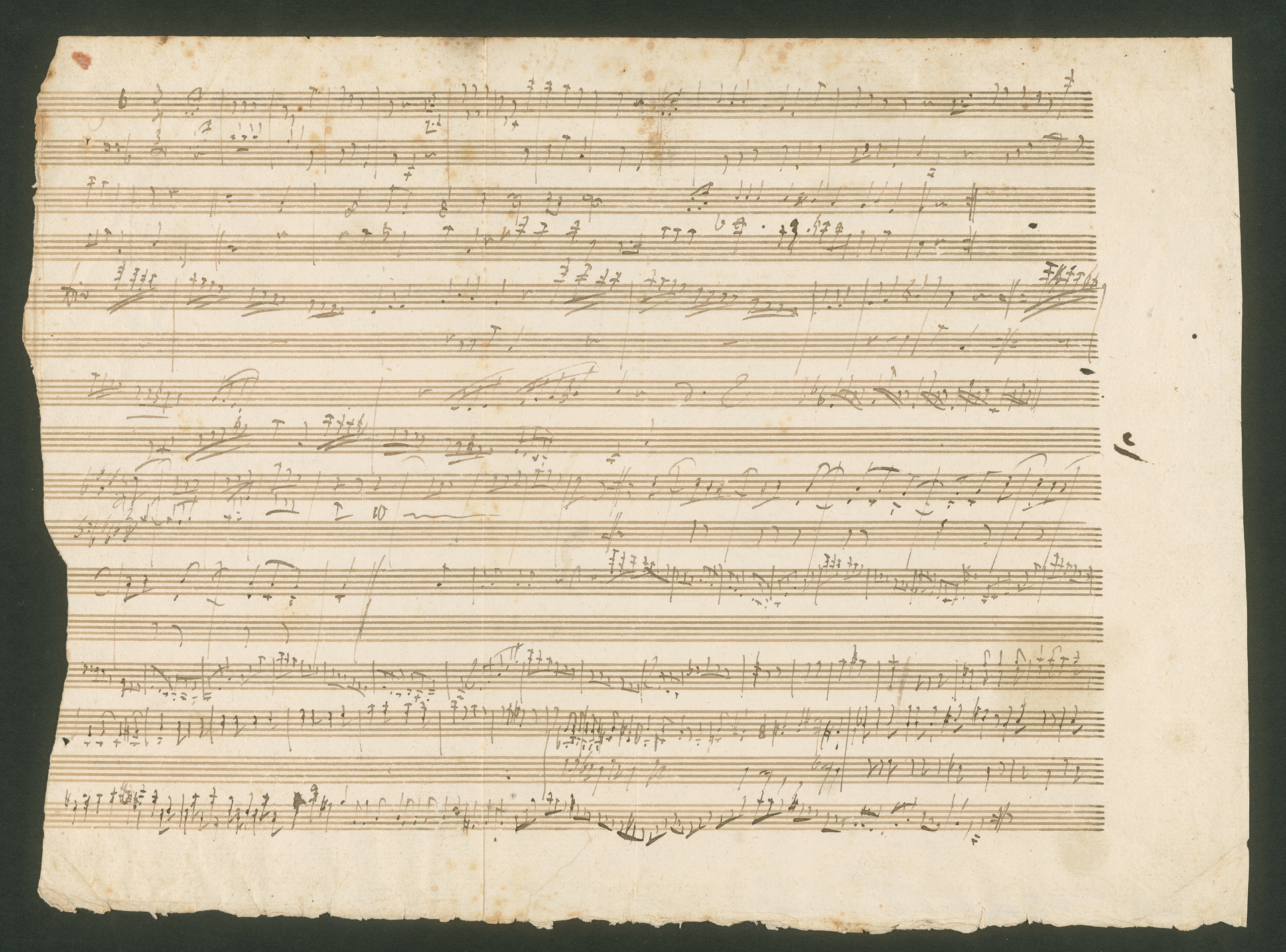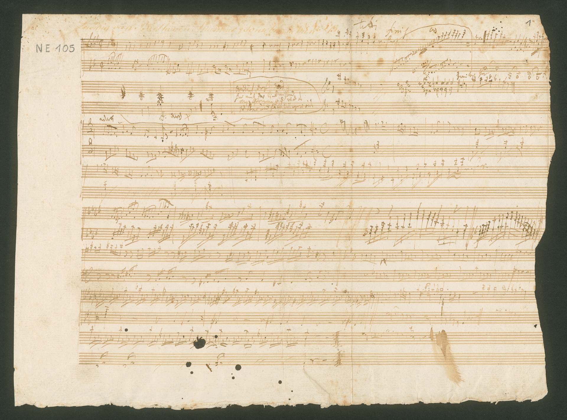 A total of 18 sketches and drafts for discontinued works can be found on this leaf, which can be dated to Beethoven's early years in Vienna (he lived in Vienna from 1792 onwards), even though they do not bear any date. This is supported by the handwriting, which had a gentler touch in Beethoven's younger years and whose changes and deformation over the years has been well documented. In addition this leaf is made of paper which Beethoven used solely between 1792 and 1796. It has a striking characteristic, which enables identification beyond a doubt: its rastrology (staff-ruling). On folding a large sheet in the usual manner in the paper manufacturing process, bifolia arise with a fold in the middle on binding. Generally the staves were ruled on these bifolia separately so that a free margin was left on all four sides of the single leaf. Yet the type of paper Beethoven used for this sketchbook is ruled differently, namely across the complete spread of the bifolium (right across the middle fold). Thus there is no margin on the inner side of the leaf where it is bound. (J.R.)