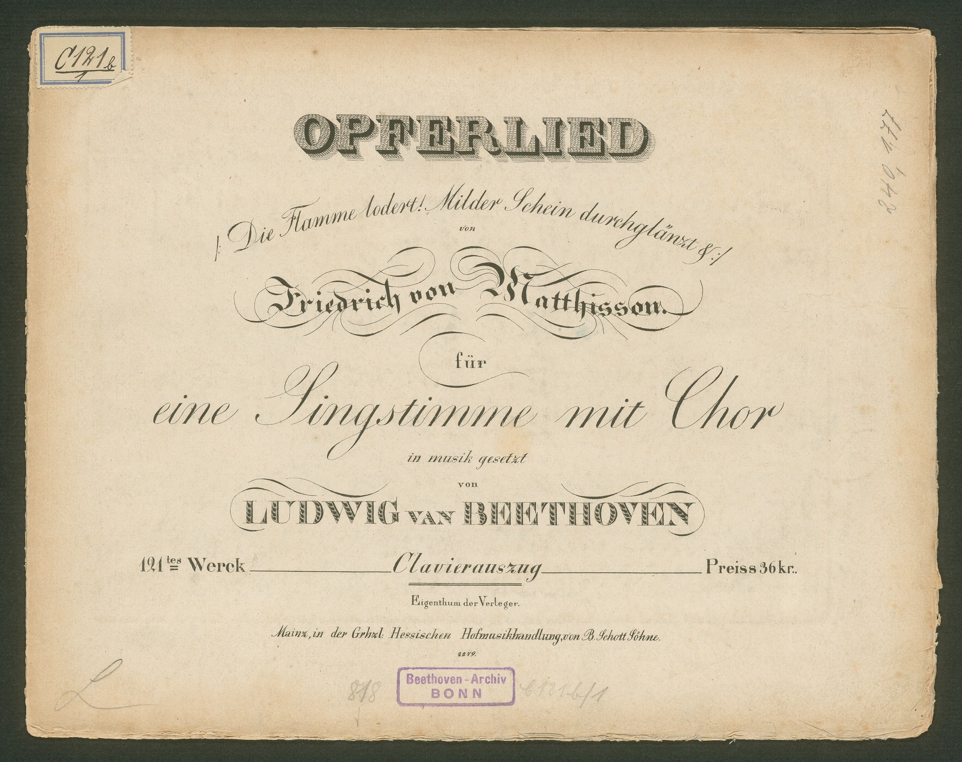 Ludwig van BeethovenFriedrich von Matthisson, "Opferlied" für Singstimme, Chor und Orchester op. 121b, Klavierauszug, Schott, 2279