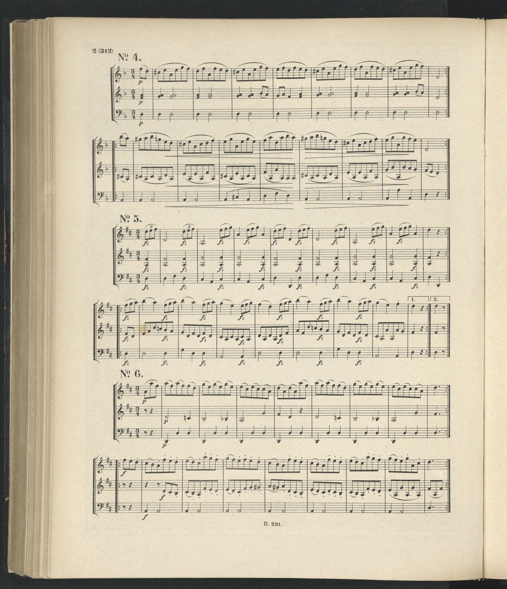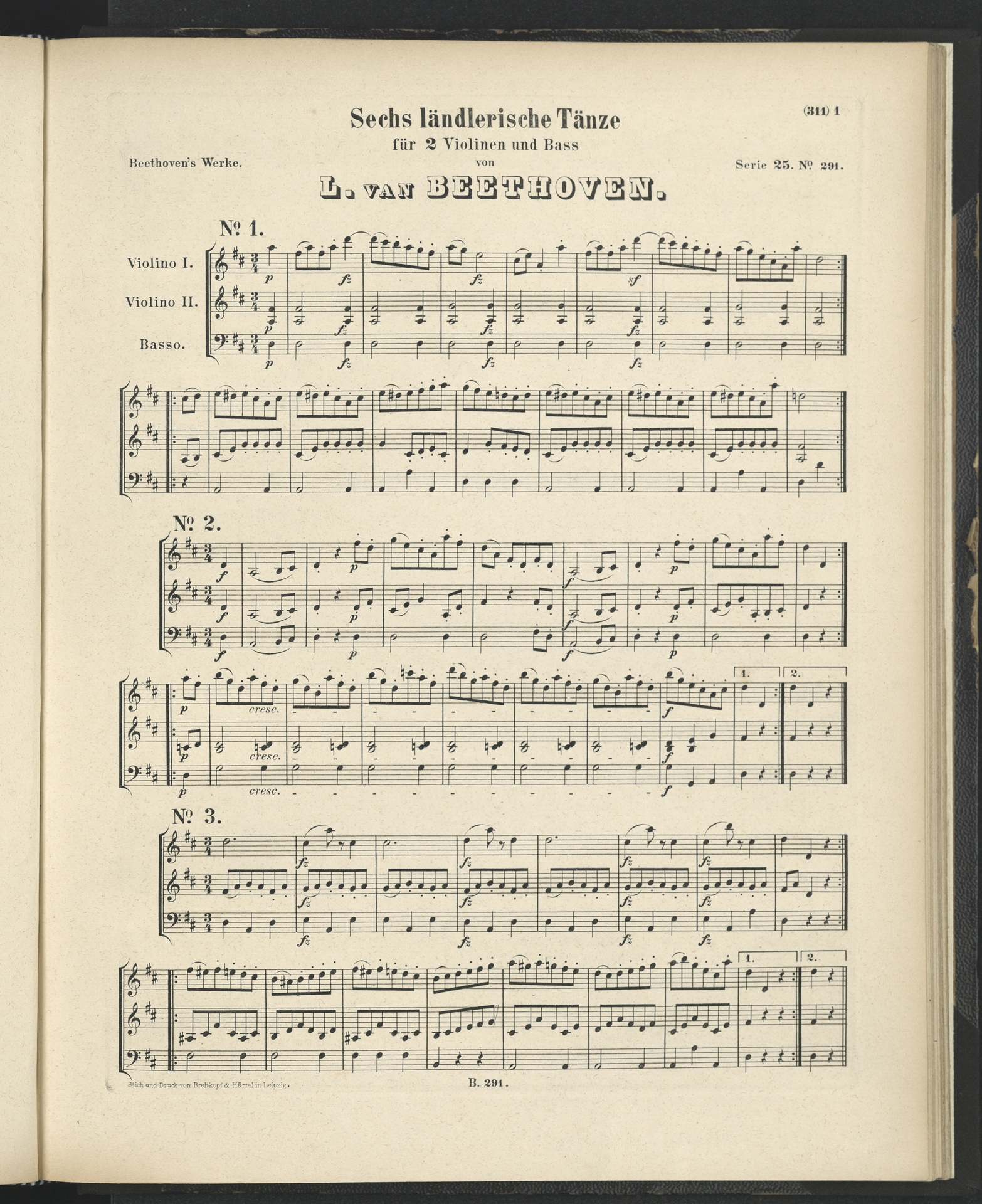 Ludwig van Beethoven, Ländlerische Tänze für 2 Violinen und Bass (D-Dur) WoO 15, 1-6, Partitur, Breitkopf und Härtel, 291