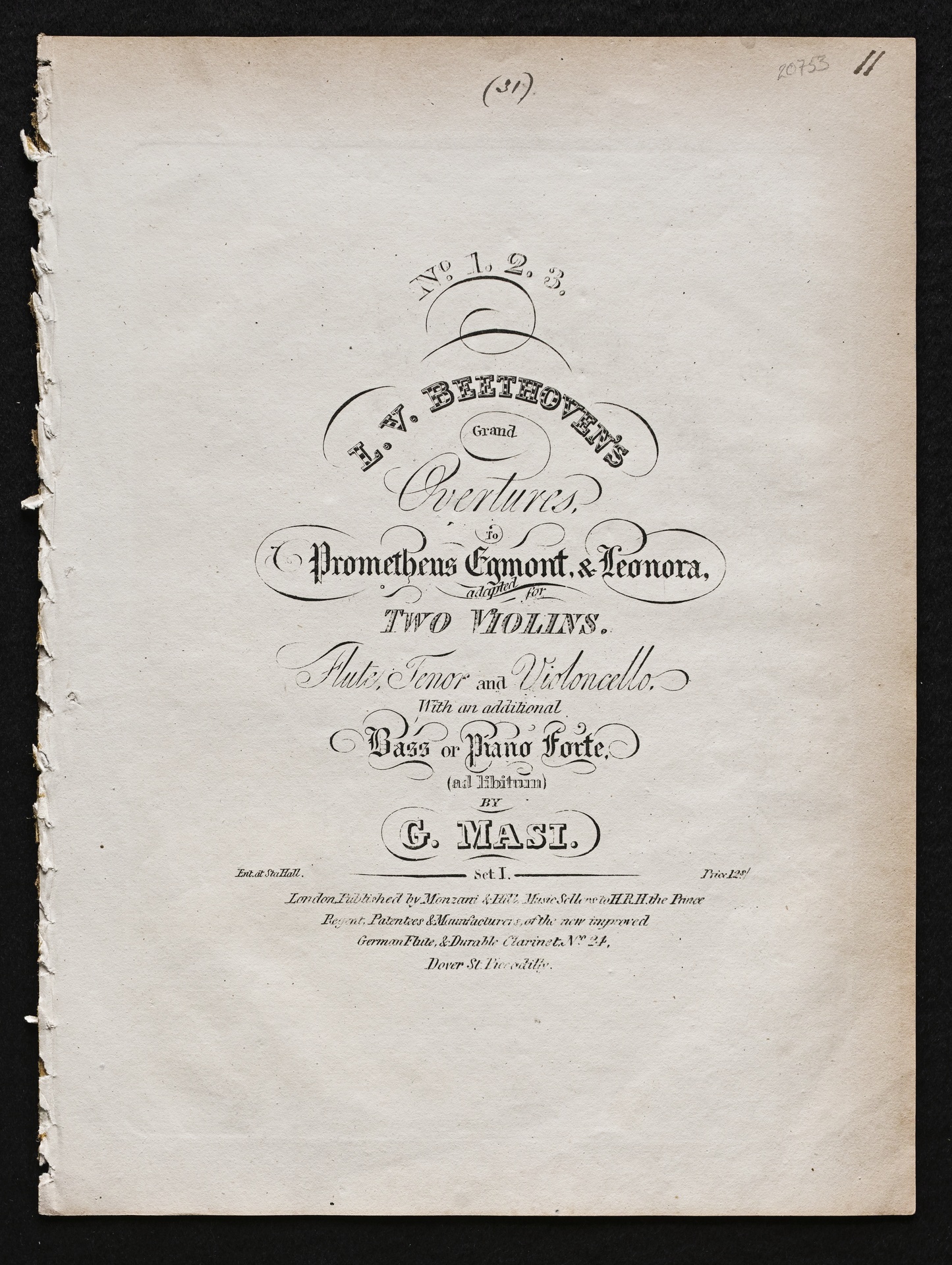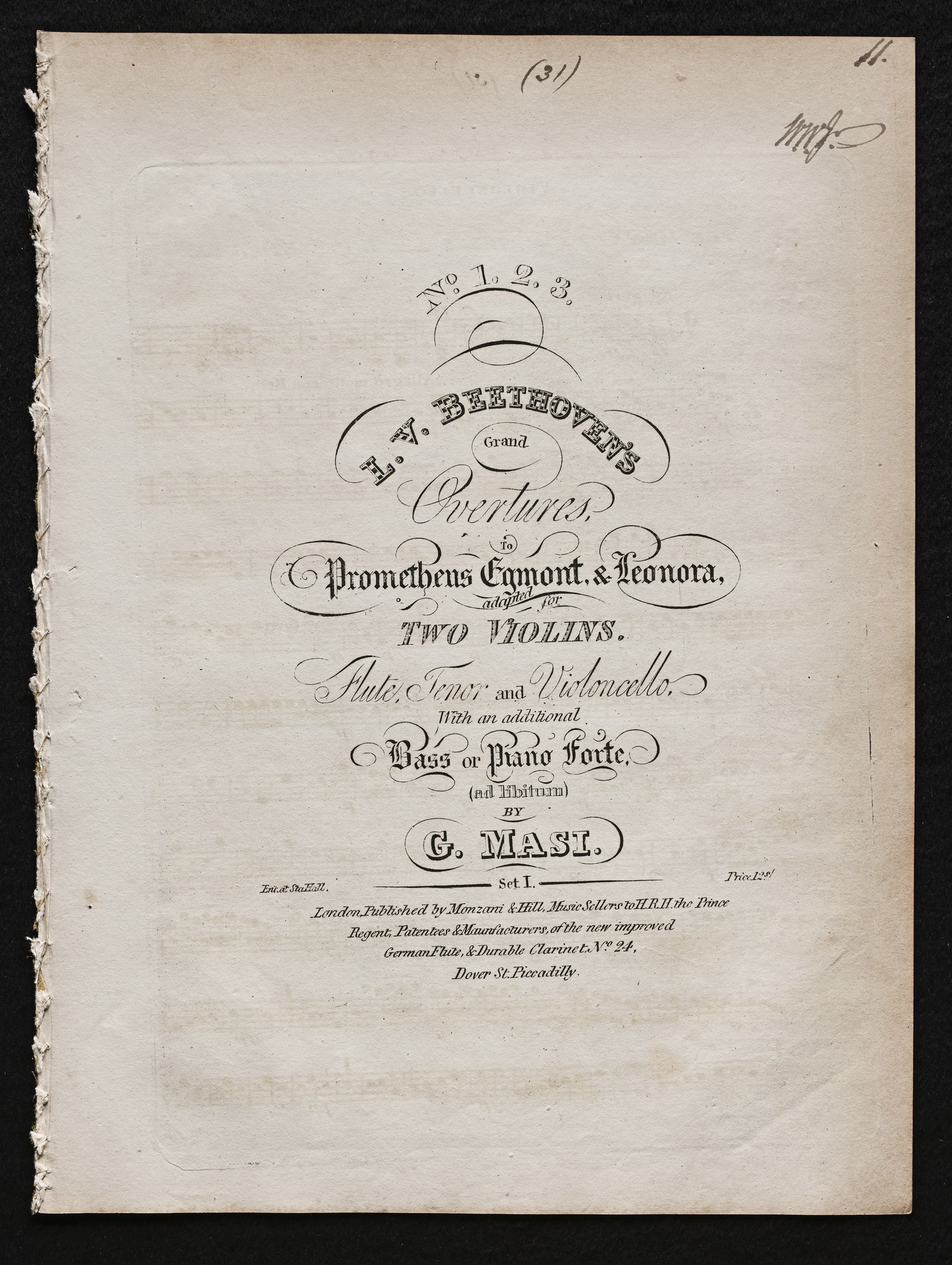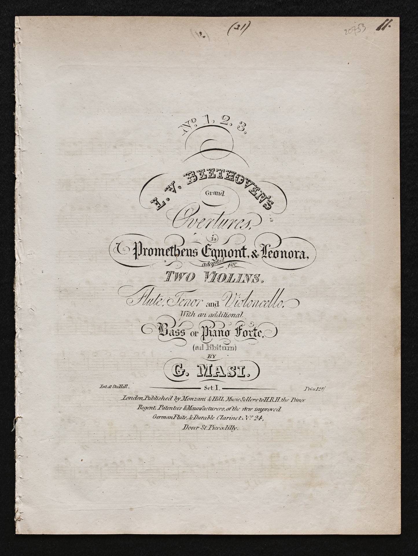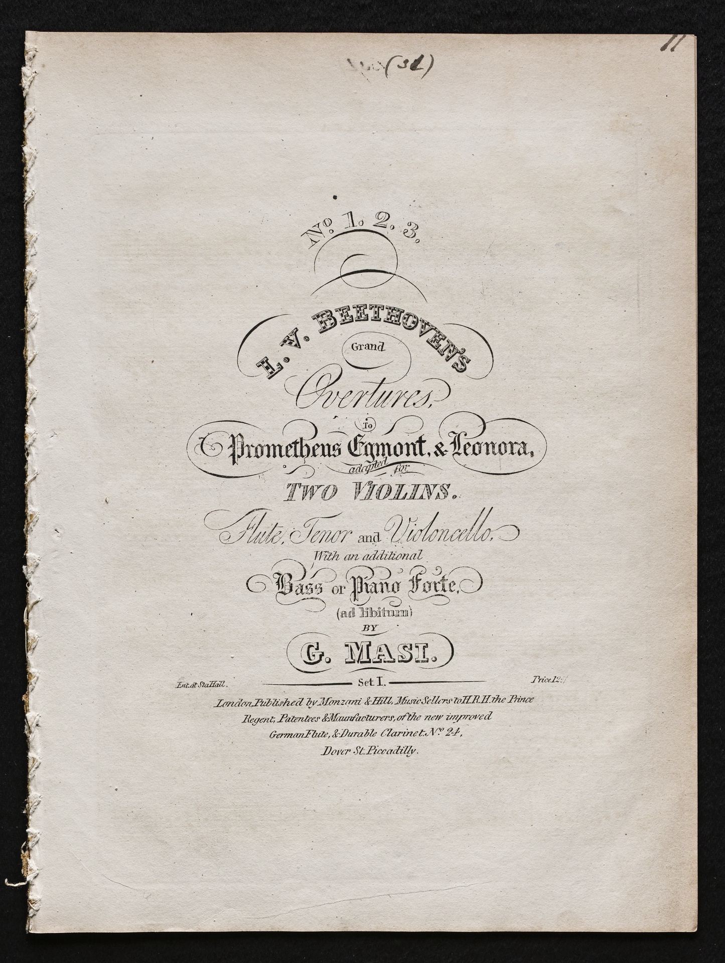 Ludwig van Beethoven, Sammlung von Ouvertüren zu op. 43, op. 84 und op. 72, Bearbeitung für Flöte, 2 Violinen, Viola, Violoncello von Girolamo Masi, Stimmen, Monzani and Hill