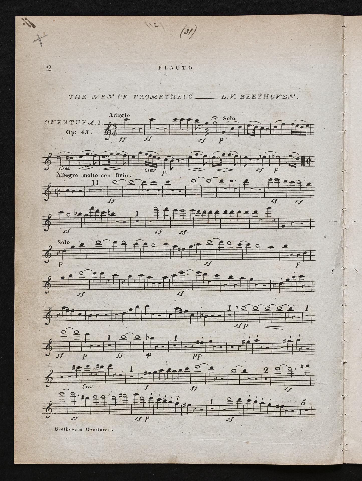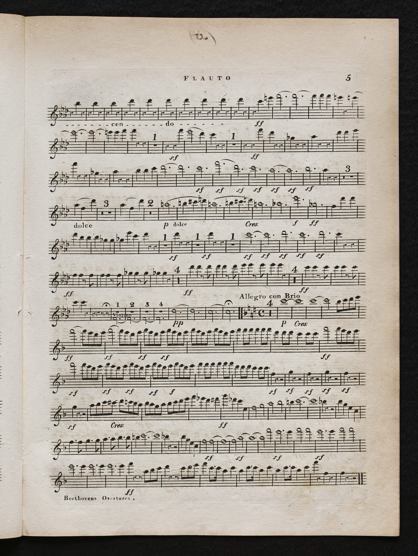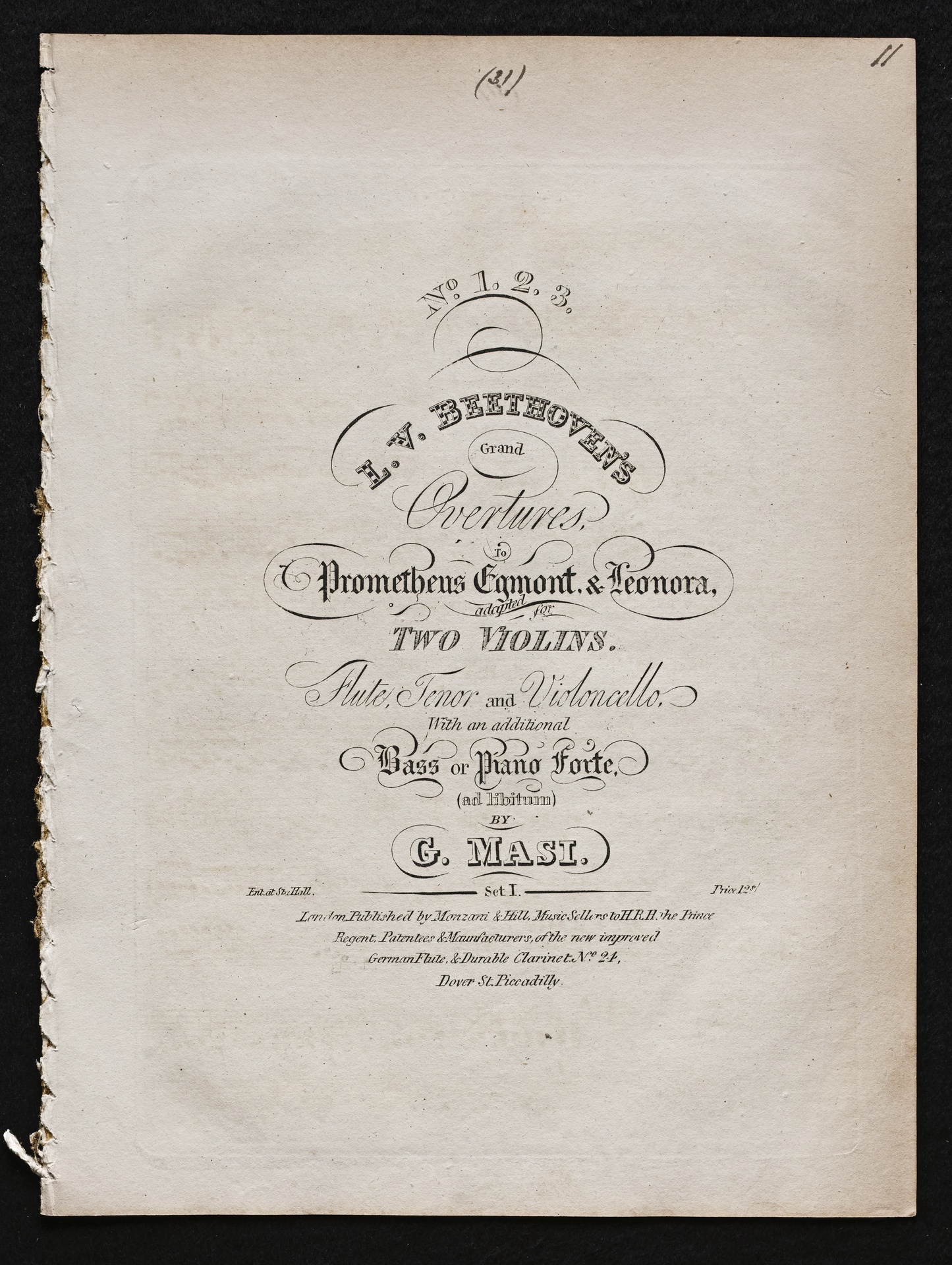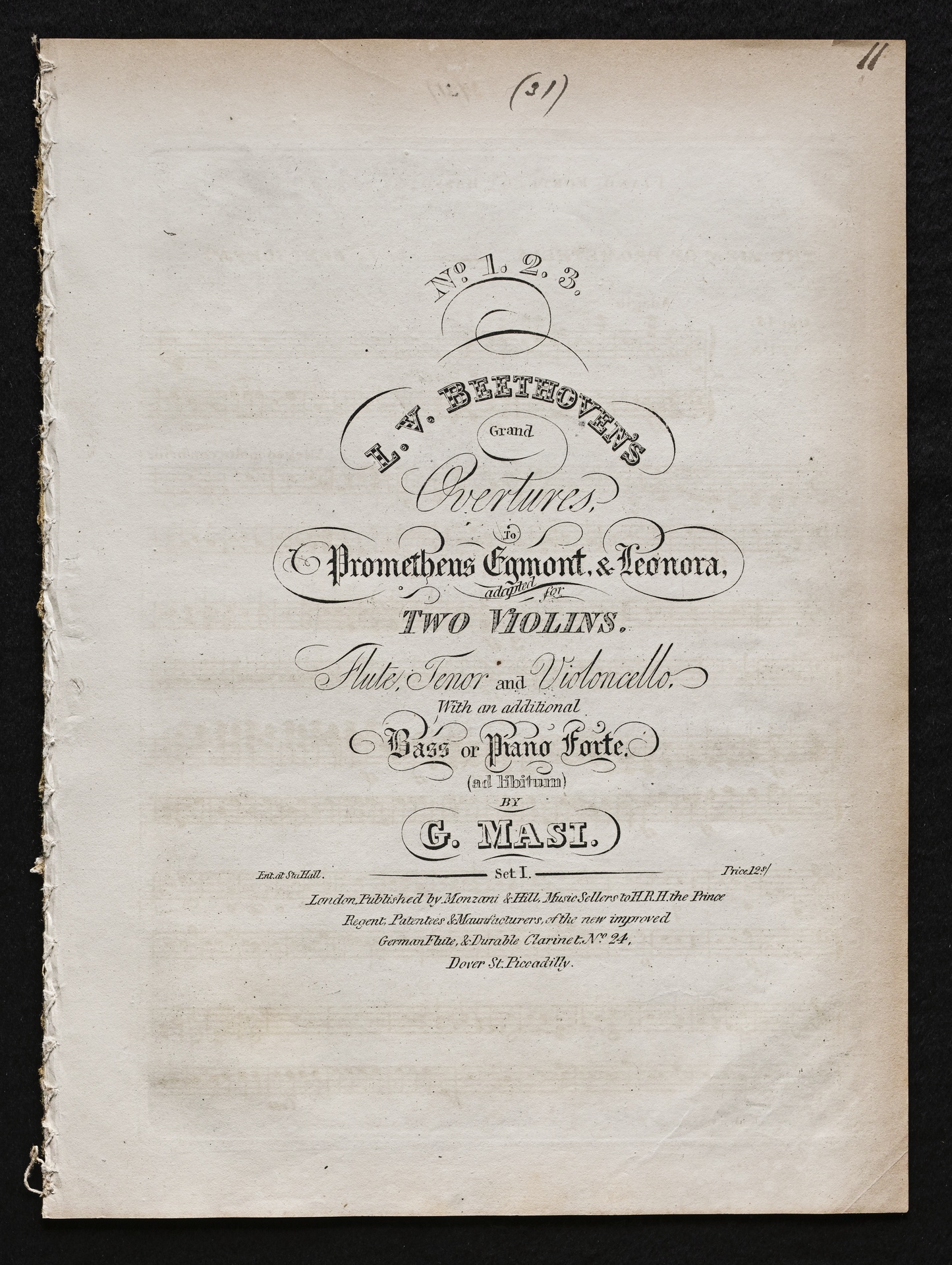 Ludwig van Beethoven, Sammlung von Ouvertüren zu op. 43, op. 84 und op. 72, Bearbeitung für Flöte, 2 Violinen, Viola, Violoncello von Girolamo Masi, Stimmen, Monzani and Hill