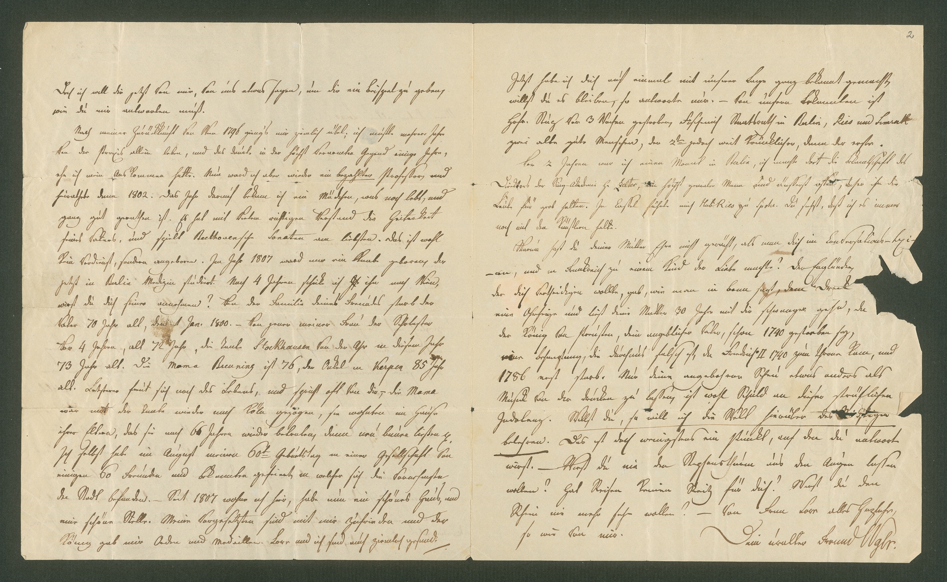Surprised Wegeler asks why Beethoven has never reacted to the claim made by Fayolle in Brockhaus' Conversations-Lexikon that he is the illegitimate son of King Friedrich Wilhelm II of Prussia. He asks Beethoven to refute the claim and at the same time offers to do so on his behalf.