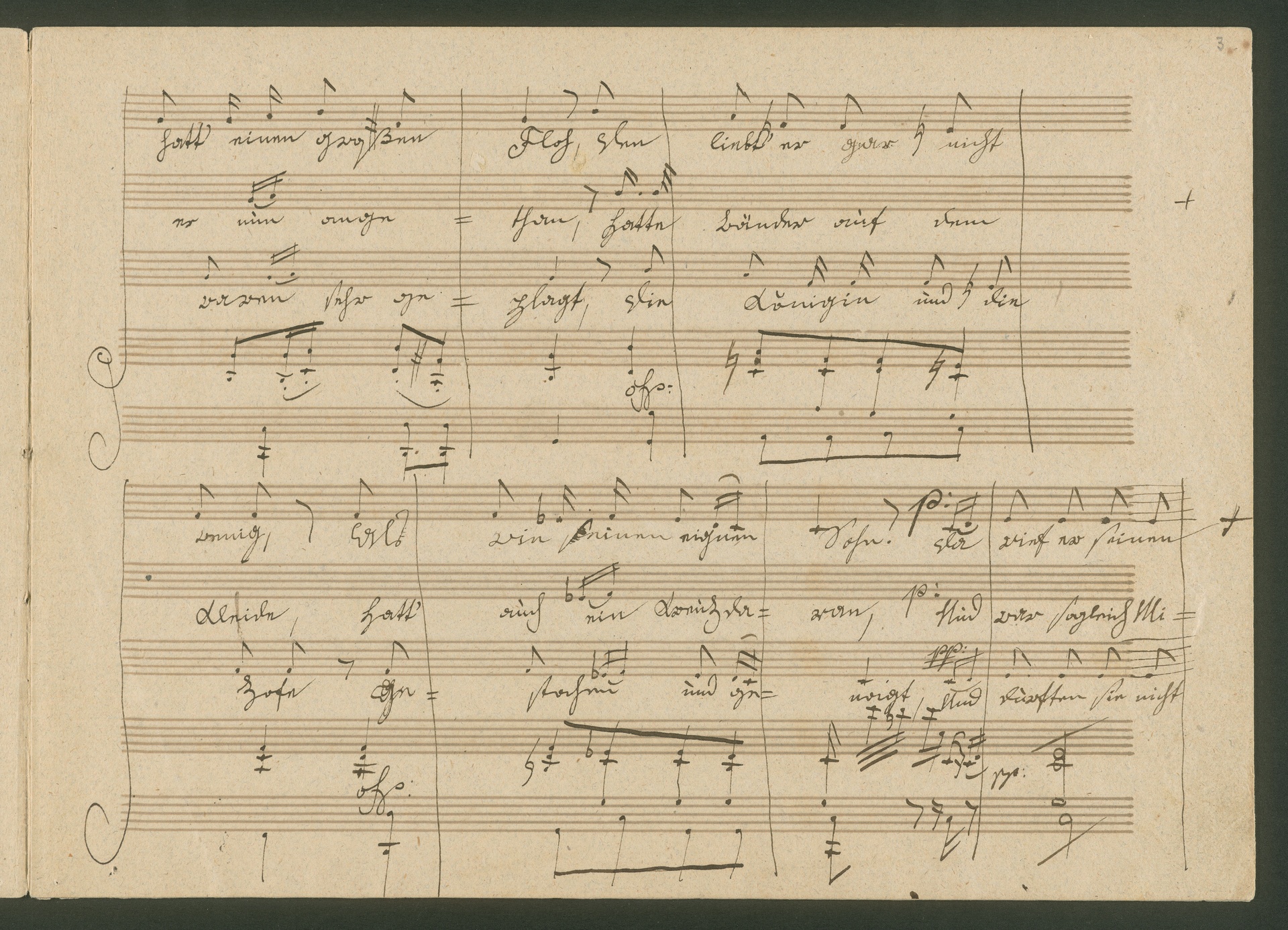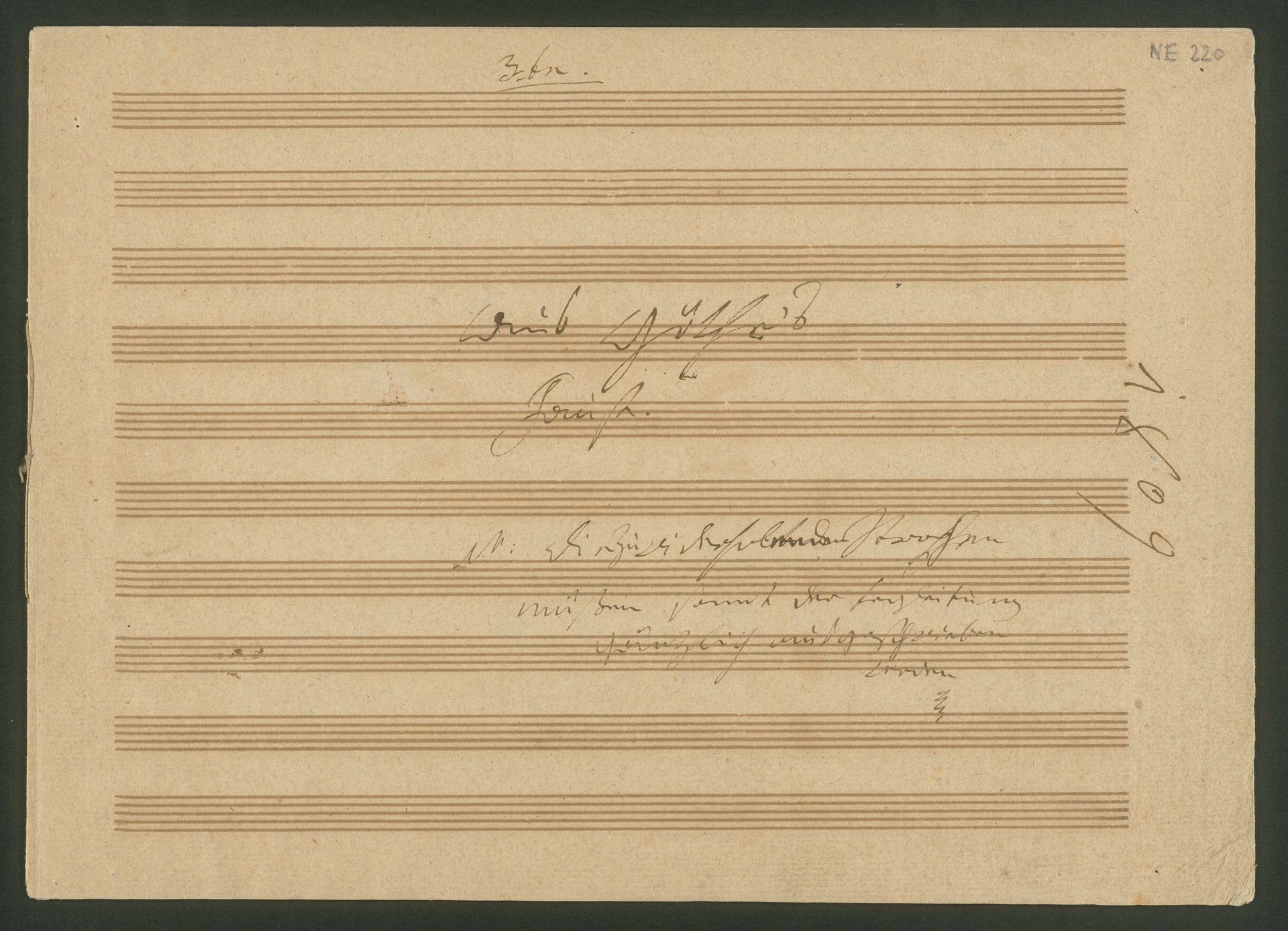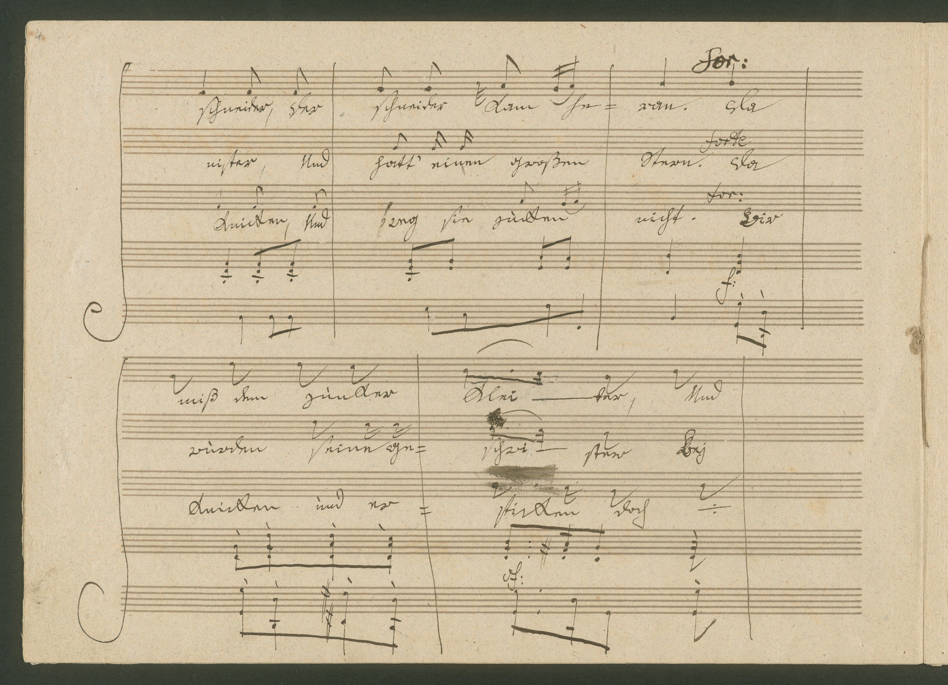 A happy crowd of students are sitting in a tavern, drinking heavily and singing bawdy songs. Faust and Mephisto join them. Mephisto adds to the merriment with a song about the takeover of a royal court by a flea. This is the scene "Auerbach's cellar" in Goethe's Faust Part I. The so-called Flohlied has been set to music by many composers, including great names such as Franz Schubert, Richard Wagner, Hector Berlioz and Modest Mussorgsky. However, what is thought to be the first setting is by Ludwig van Beethoven. Goethe's Faust first appeared in 1808. The Flohlied had, however, already appeared in the same form in the "Faust Fragment" of 1790. The young Beethoven was probably familiar with the Faust Fragment, as he had already made a very extensive musical draft for the first verse of the song in the 1790s. The final version of the song from 1809 (Beethoven wrote this date diagonally across the title page) mainly follows the first draft. Beethoven composed the song as incidental music, so that it could be sung on the stage as part of the tragedy. The accompaniment is simple. The vocal part is not demanding - there are no difficult leaps or complicated rhythms, it is rather declamatory. Goethe's text is divided up into three verses and Beethoven also sets it as a strophic song. He notates the text of each verse in a separate stave, without repeating the musical text. He only adds changes to the rhythm at the points where the declamation diverges. In Goethe's scene everyone joins in with Mephisto's song at the end and they all repeat the two last verses. Beethoven also includes this "chorus" (but does not compose it for several voices). The manner of writing, and also the directions to the copyist which Beethoven wrote on the title page and before the beginning of the chorus, suggest that the autograph score was a copy made by the composer rather than a working autograph score of the composition. (J.R.)
