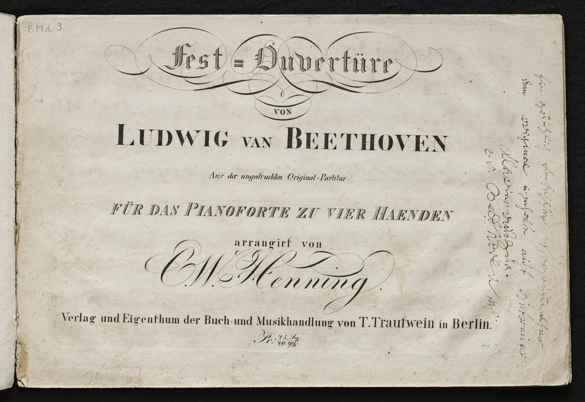 Ludwig van Beethoven, Ouvertüre (C-Dur) zu Carl Meisls Festspiel "Die Weihe des Hauses" op. 124, Bearbeitung für Klavier zu 4 Händen von Carl Wilhelm Henning, Trautwein, mit handschriftlichen Eintragungen Beethovens