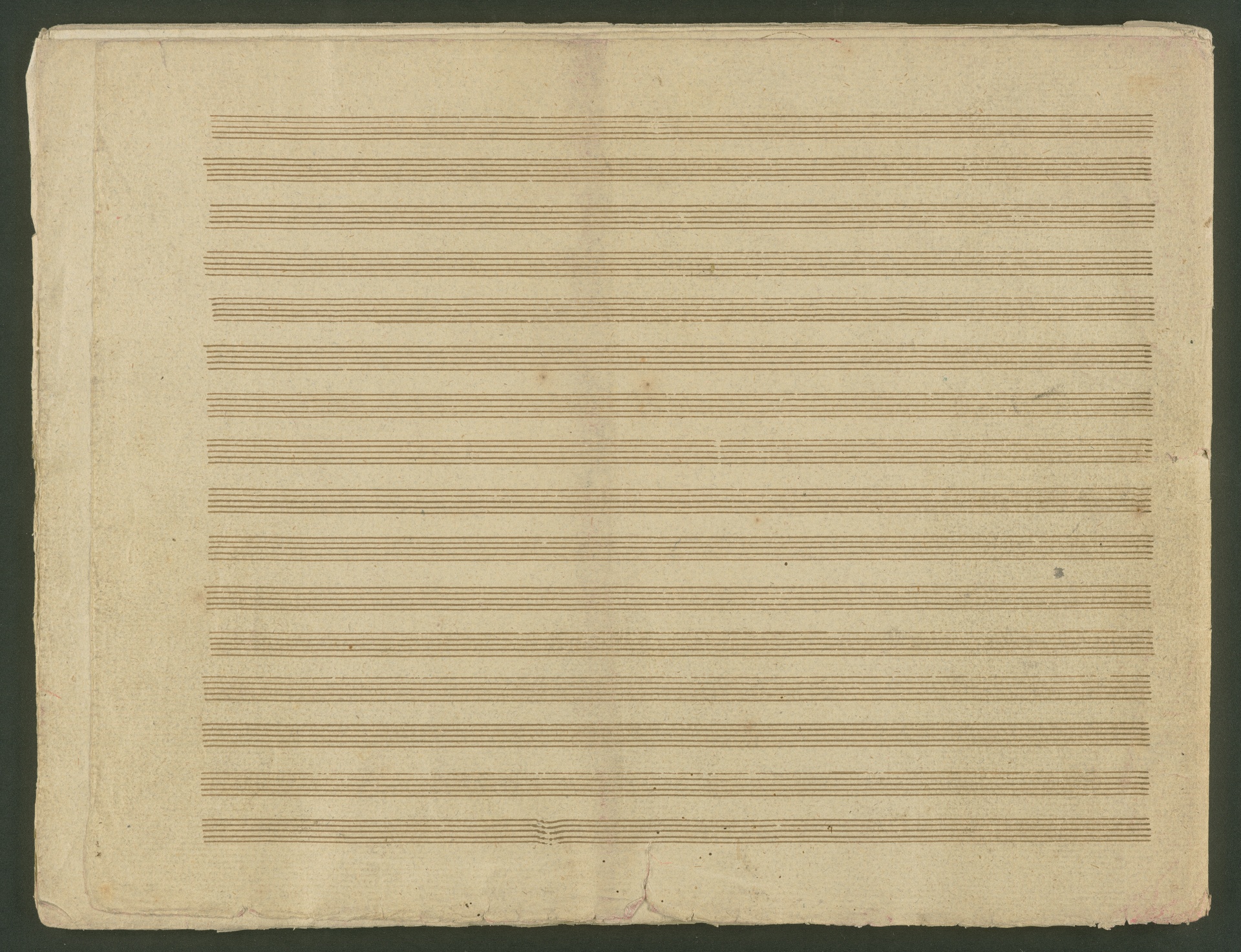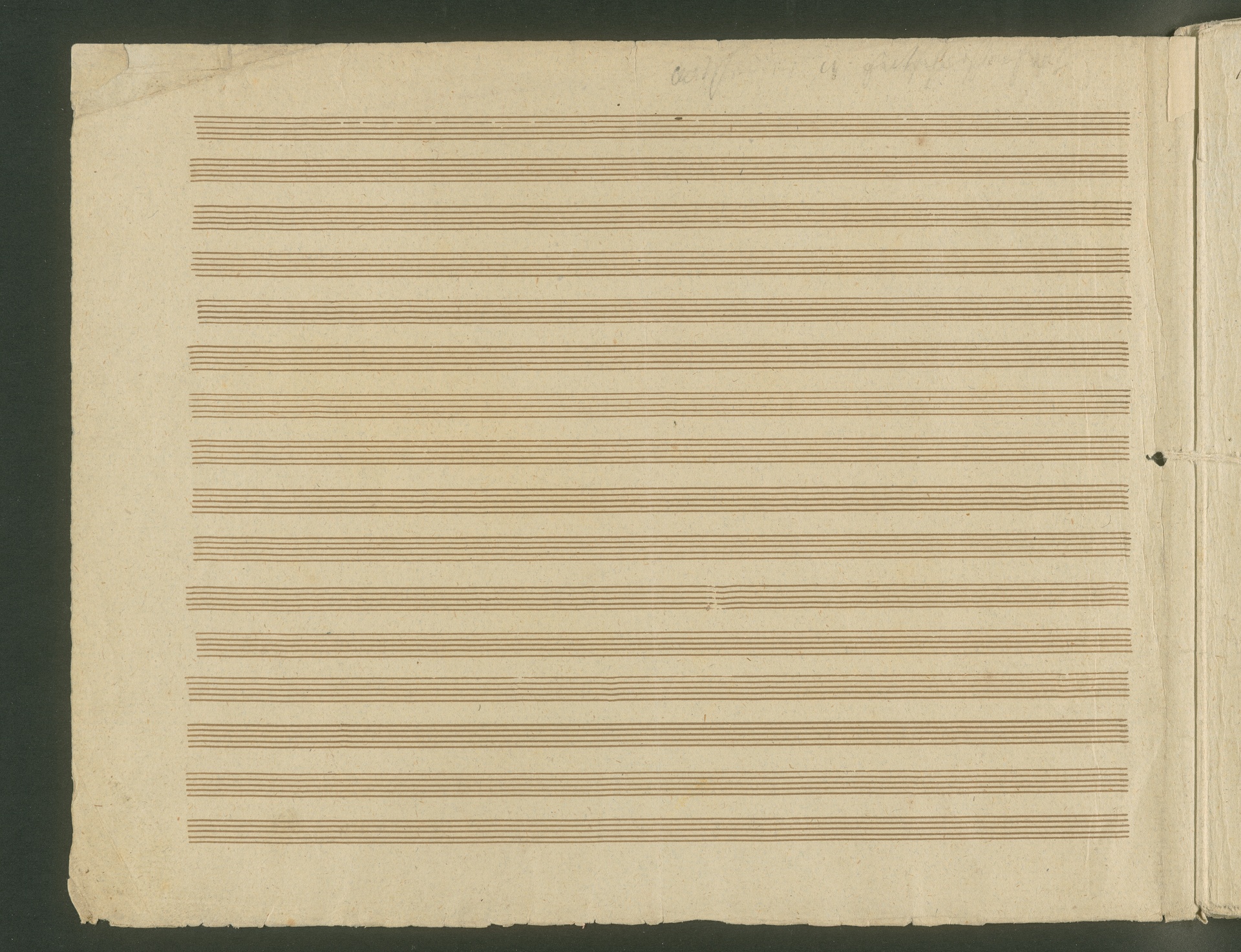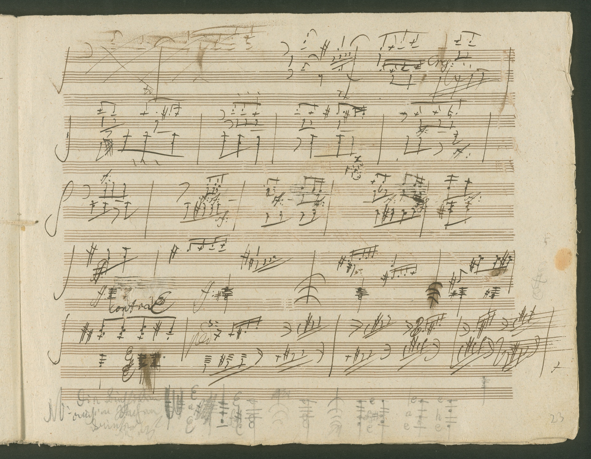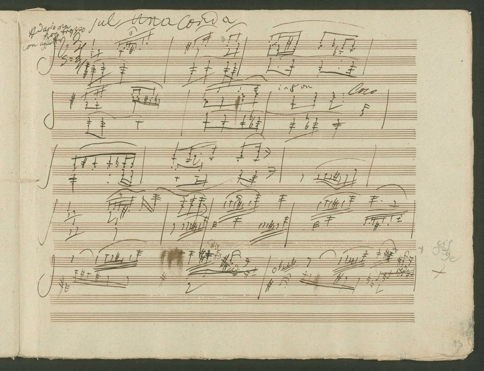 In order to be able to write this note, another four leger lines are necessary, written beneath the usual five line stave. For the untutored eye bottom E is really a very difficult note to read! Beethoven also had his difficulties with the notation and practised it: at the bottom of the title page (image 1) in pencil, on leaf 5r (image 9) in red crayon, and on leaf 16r, the last page of music, (image 31) in pencil and ink. On leaf 13r (image 25) Beethoven made a note of the "Contra E-Problem" (bottom E problem) in pencil on the full lowest stave, giving each note an additional letter, adding a comment for the engraver, "Nb: die Buchstaben auch im Stechen drunter gesezt" (NB the letters added underneath also in the engraving). On the same page following a correction in the 12th stave he had already added "bottom E" in ink to the musical text, insisting on this for the original edition and also for publication. In January 1817 (after the 9th and before the 23rd) he wrote to the publisher Tobias Haslinger, requesting a correction, "In the last movement in the passage where the low E appears in the 4 chords, I should like the letters to be added" (from the translation by Emily Anderson, 1961). This wish was not granted in its entirety. The plates had already been engraved. There was not enough space on the plate in question for all the letters, it would have had to be completely redone. So in the end, the publisher made do with adding "bottom E" the first time the low note appears. (J.R.)