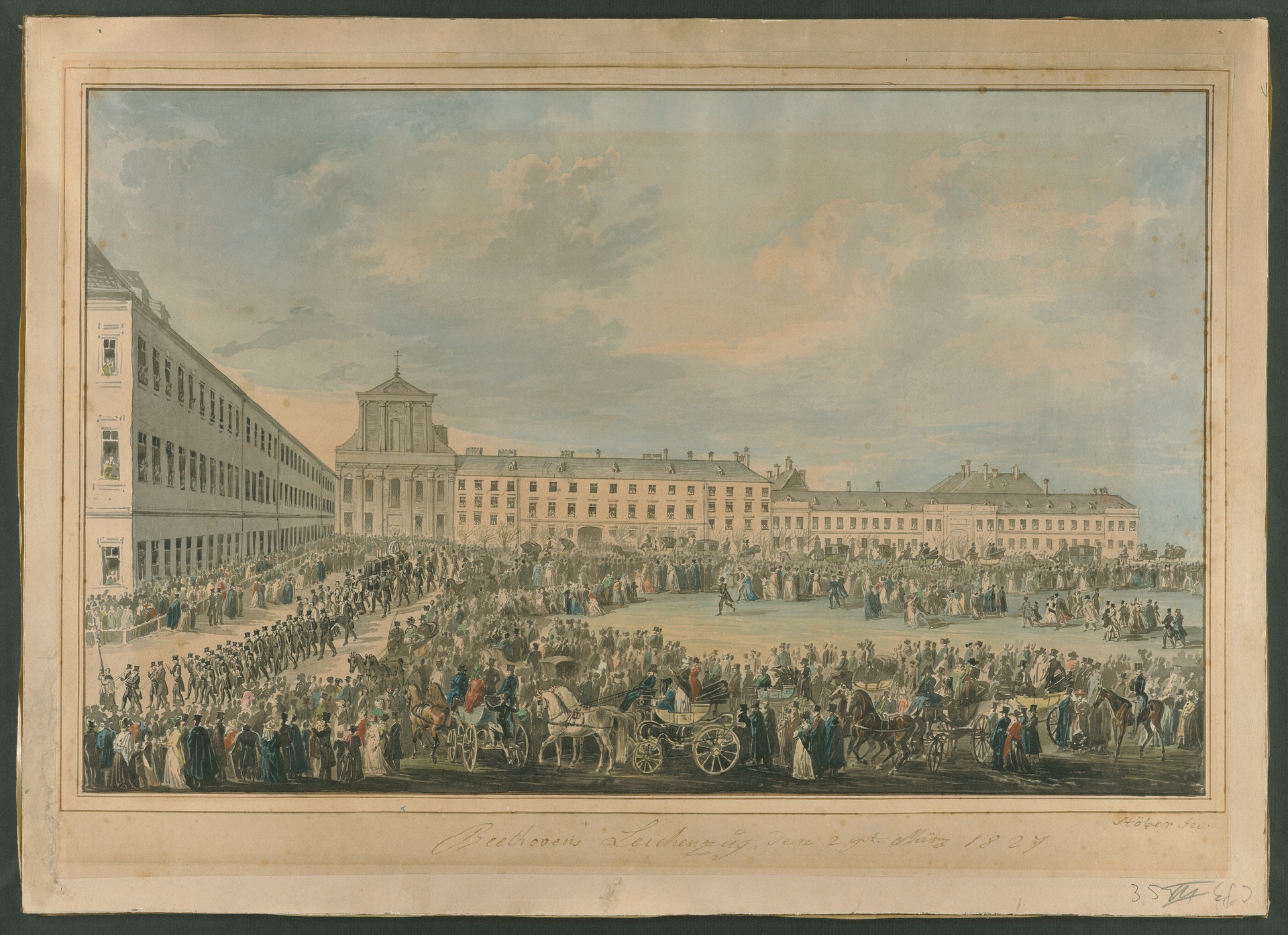 Beethovens Leichenzug vor dem ehemaligen Schwarzspanierkloster in Wien, 1827 - Aquarell von Franz Xaver Stöber