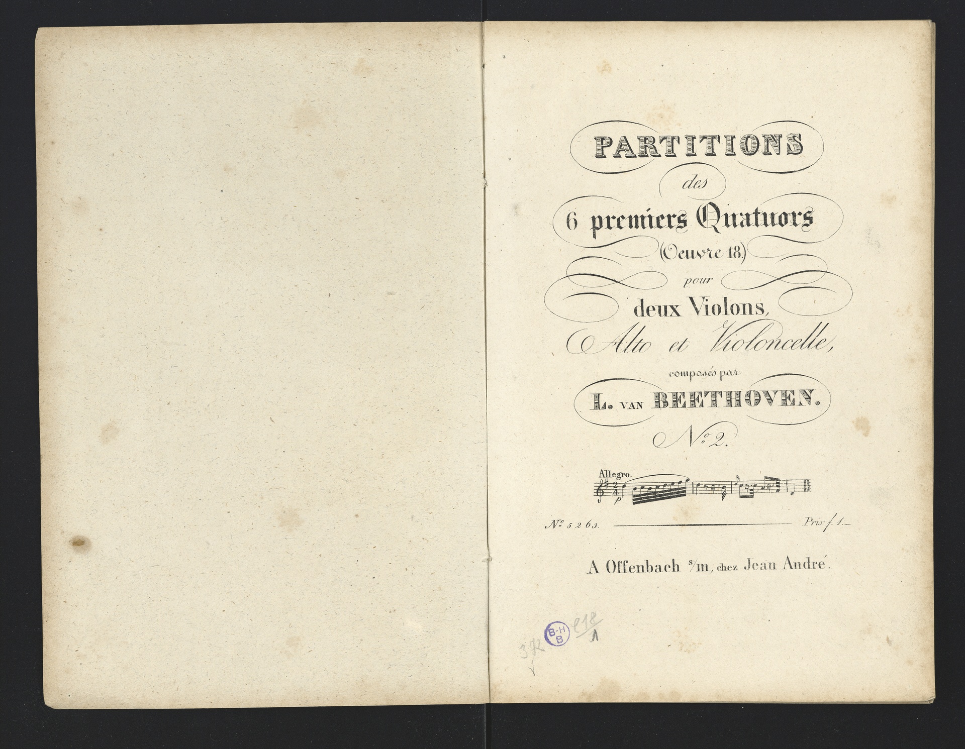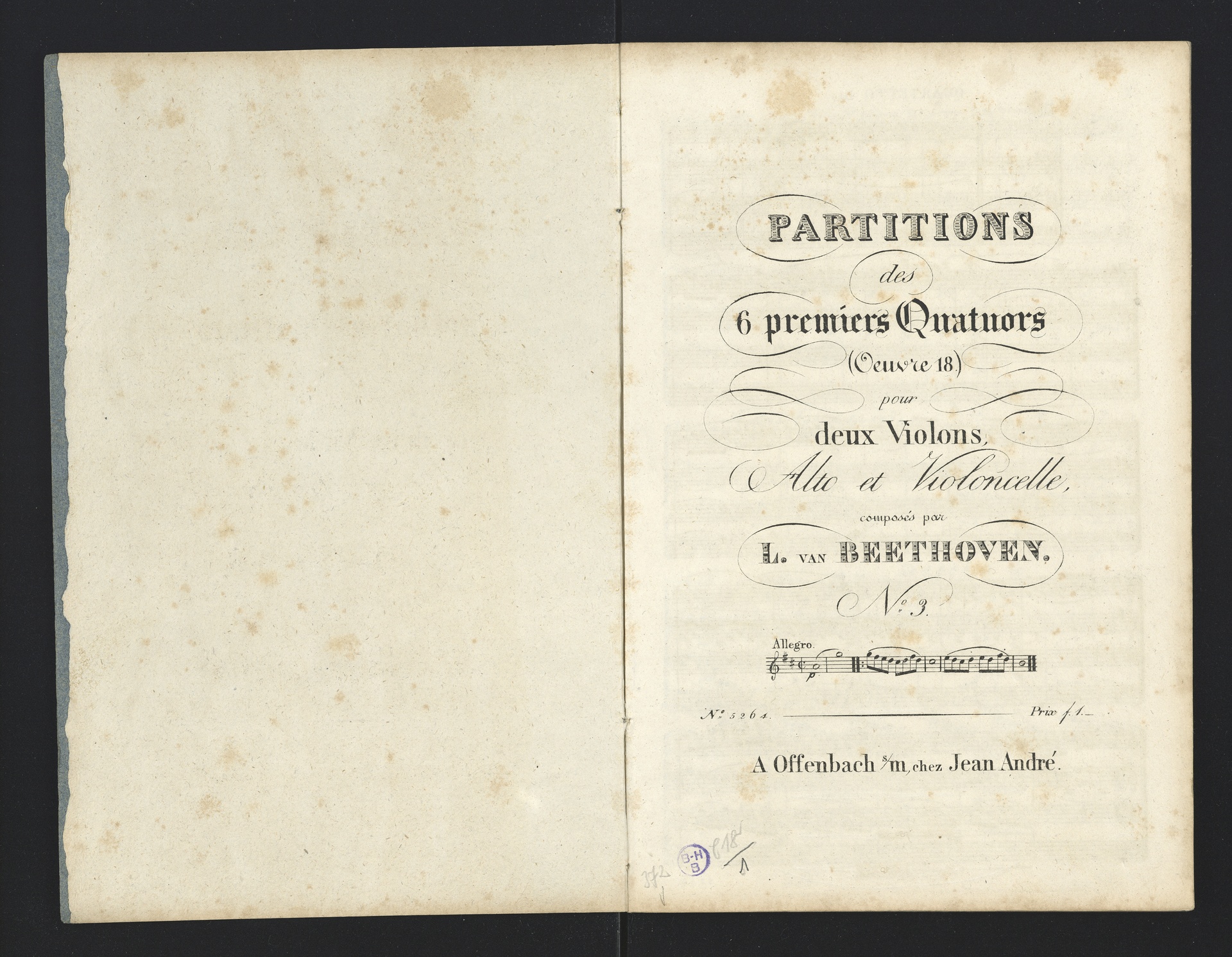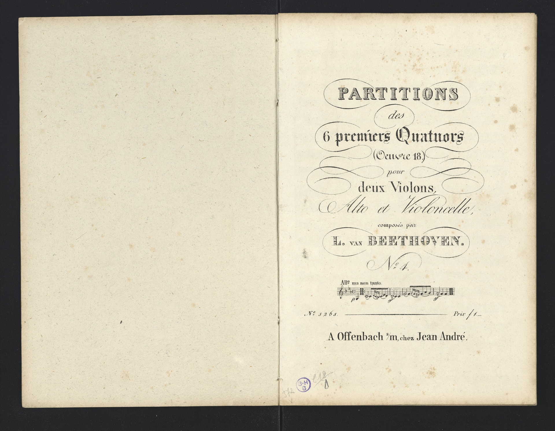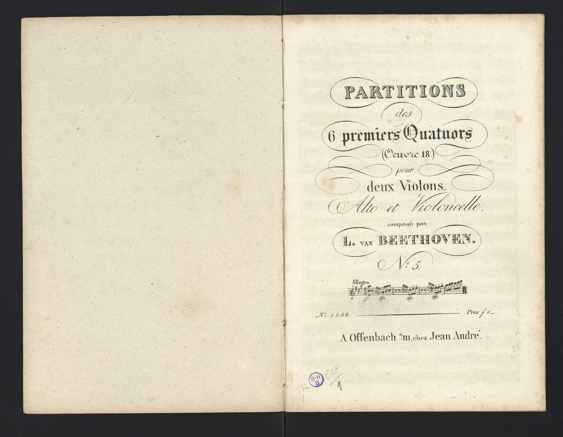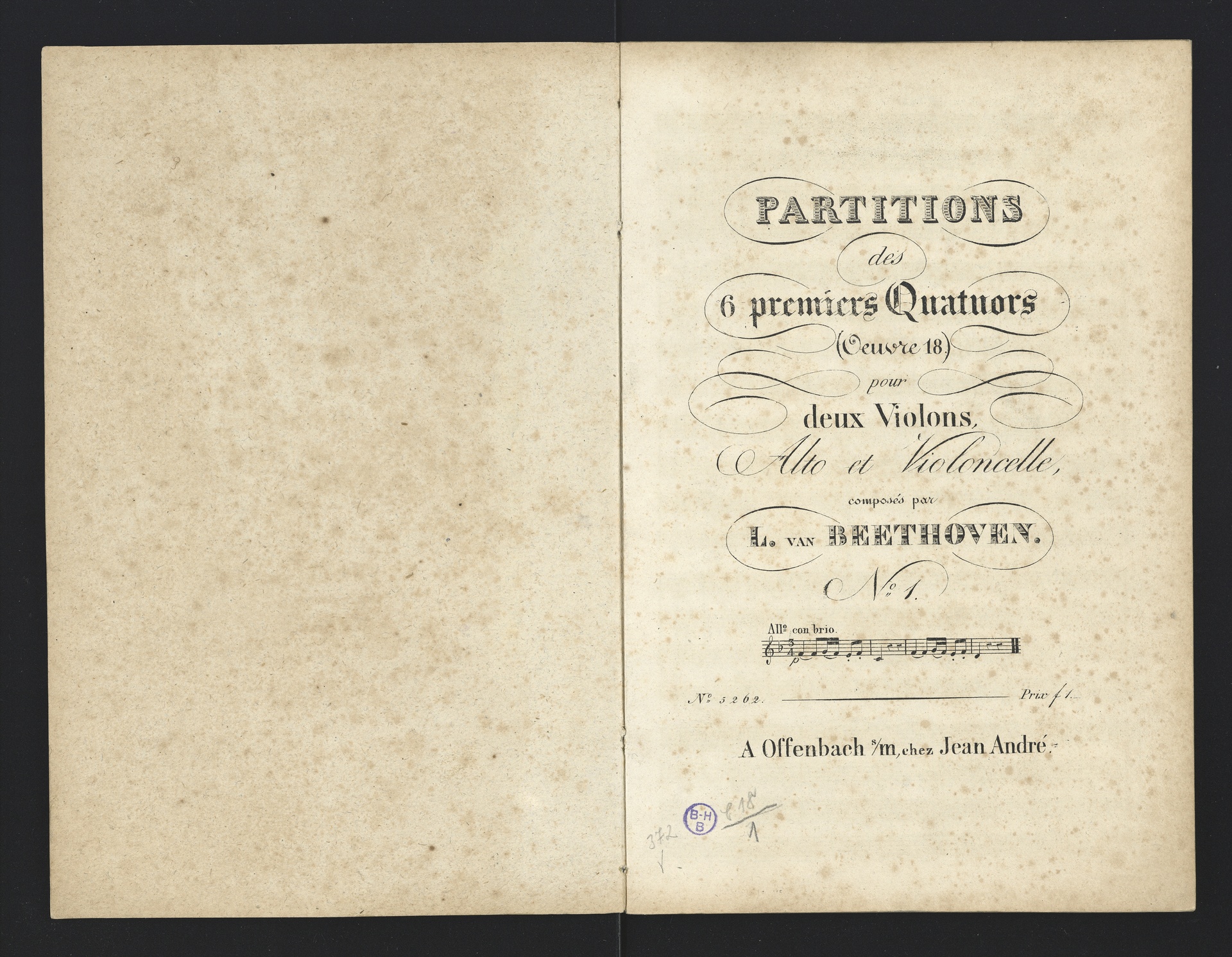 Ludwig van Beethoven, Quartette für 2 Violinen, Viola, Violoncello (F-Dur, G-Dur, D-Dur, c-Moll, A-Dur) op. 18, 1-5, Partitur, André, 5262-5266