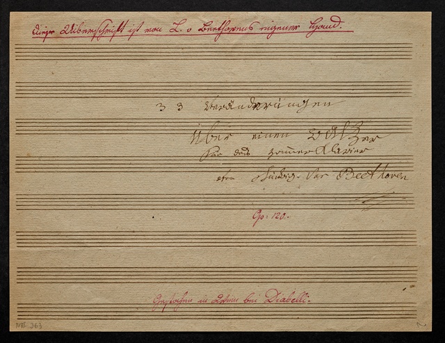 In early May 1823 Beethoven asked his former student Ferdinand Ries to find an English publisher for op. 120. However, it was not until July that he sent Ries an engraver's copy. A planned English edition of op. 120 by T. Boosey & Co. never materialized. The copy arrived in London too late as the piece had already appeared in Vienna and an English edition made no sense from a commercial standpoint. (J.R.)